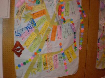 学校全員分のお願い事と、かわいい七夕飾りがきれいに張られています。