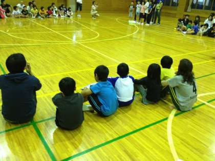 広い体育館で、全体レクレーションがはじまりました!7時30分
