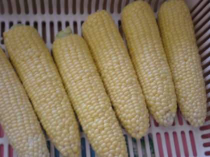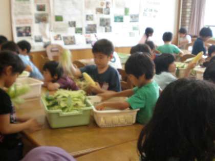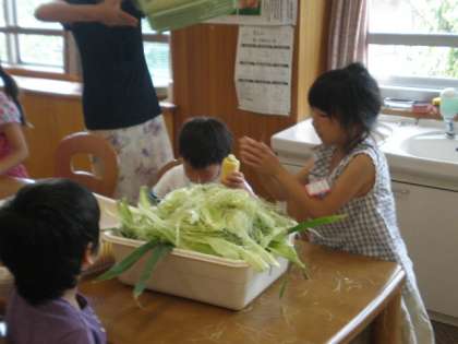 一年生の小さな手で、大きなトウモロコシの皮をむきます。