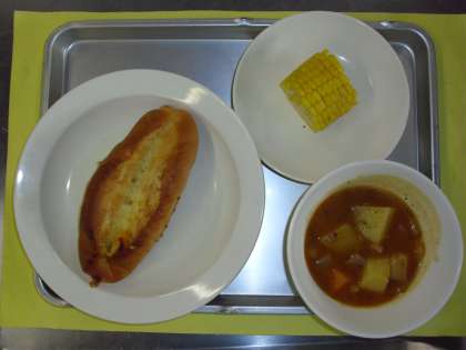 献立名 ガーリックトースト 牛乳 ハンガリアンシチュー むしトウモロコシ
