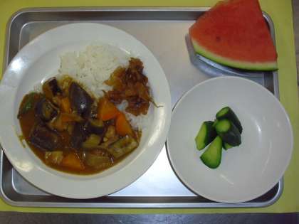 献立名 夏野菜のカレーライス 牛乳 福神漬 きゅうりのひと塩 すいか