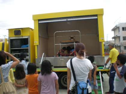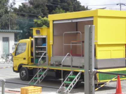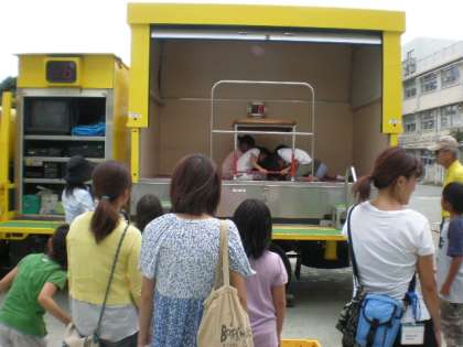 若小の校庭に世田谷区の起震車「なまず号」がやってきました。