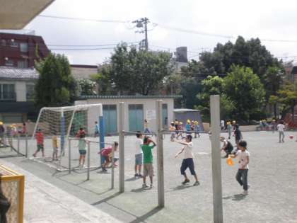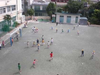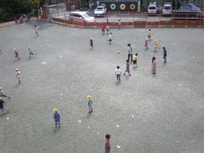 夏を思わせる日差しの中、たくさんの子が元気に外遊びをしていました。