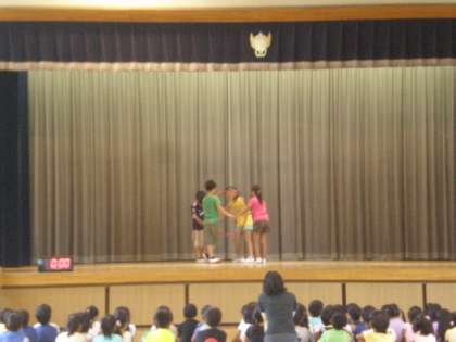 ステージの上で集会委員さんが実演を交えて説明をしてくれます。