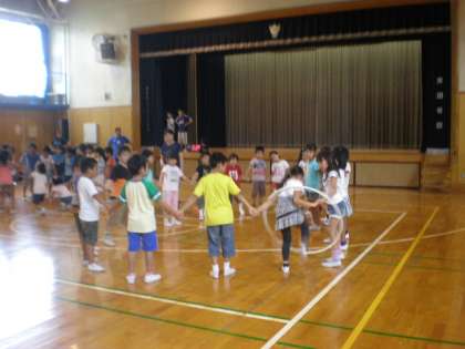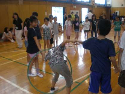 集会委員さんが用意してくれた若小名物ゲーム「フラフープくぐり」でした。