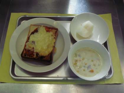 献立名 ピザトースト 牛乳 クリームスープ 梨