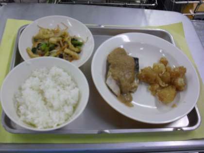 献立名 ご飯 牛乳 魚のごまだれかけ じゃがいもの甘辛煮 カリカリ油揚げと野菜のおひたし