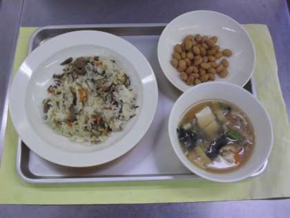 献立名 豚肉とごぼうのごはん 牛乳 吉野汁 ぶどう豆