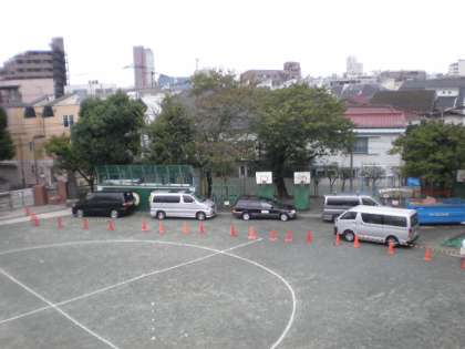 校庭にもたくさんの車がきて、職人さんたちががんばって作業をしてくれています。