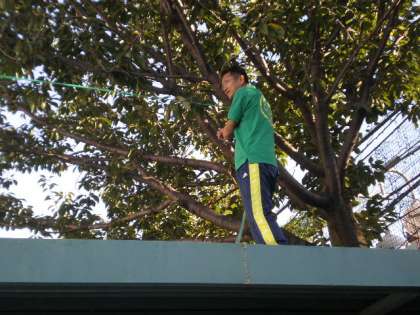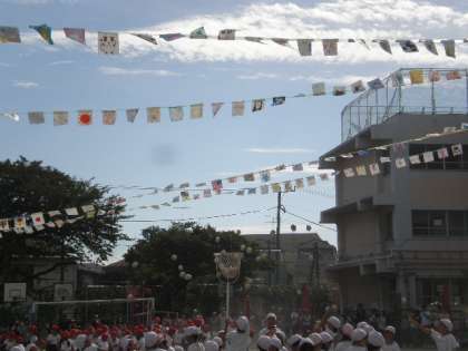 校長先生も体育倉庫の屋根によじ登って、楽しそうに旗を取り付けていました。