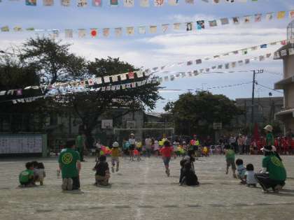 校庭の真ん中を1年生よりも小さな子たちが一生懸命に走ります。