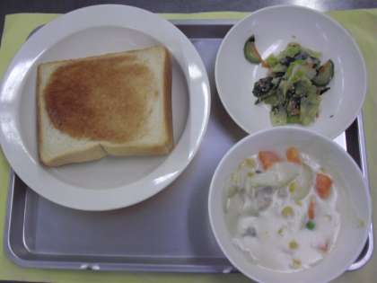 献立名 シナモントースト 牛乳 コーンシチュー わかめサラダ