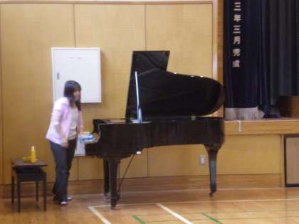 コンサートに備えて音楽の先生がピアノを磨いていました。