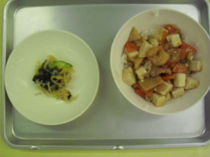 献立名 豆腐の五目炒め丼 牛乳 じゃこサラダ