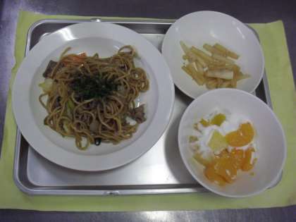 献立名 ソース焼きそば 牛乳 大根の中華味 フルーツヨーグルト