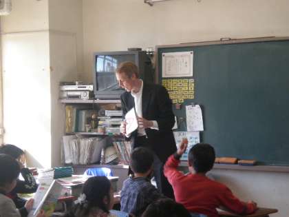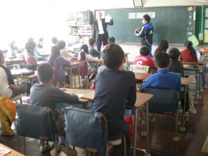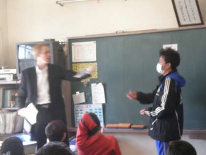 すごく背の高いALTの先生を見て、みんな大喜びです。