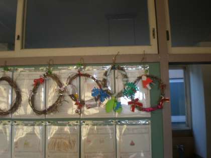 1年生の教室にはかわいいリースがたくさんかかっています。