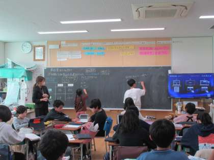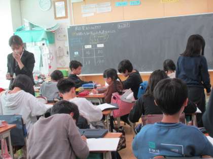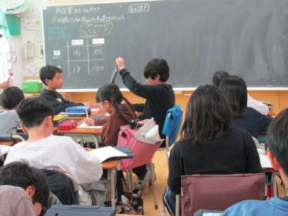 11月19日(火)6校時に5年3組で算数の研究授業が行われました。先生2人の走る速さについて、かかった時間と走った距離で比べ、どちらが速いか計算で答えを導き出しました。既習事項を活用して自力で解決する子や、友達と交流して考えをまとめたりしている子もいました。量が違うものをどのように比較すればよいのか、理解を深めていました。