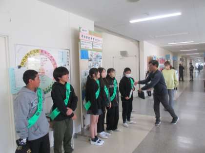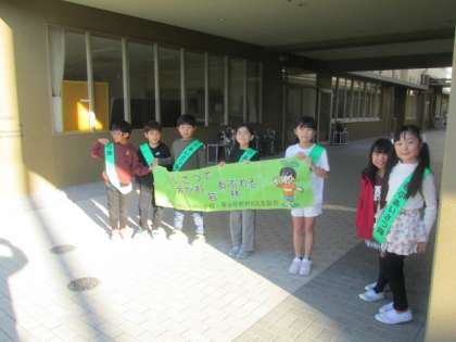 あいさつ当番の日は、皆よりも早めに登校して、あいさつ当番の準備をします。たすきをかけて、垂れ幕をもって準備OKです。校舎内や正門に立って、元気なあいさつをしてくれています。登校してくる友達もいつもより声が晴れやかです。本校の伝統の取組「若小あいさつ運動」爽やかなあいさつから1日を始められるように、続けていきます。