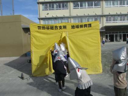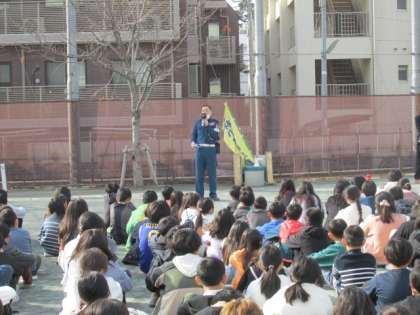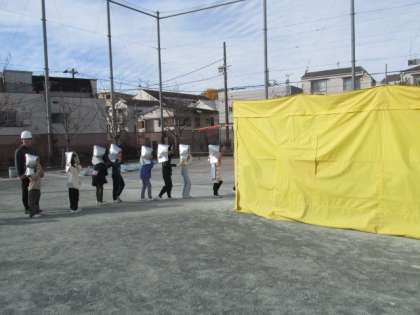 12月11日(水)に2学期最後の避難訓練を実施しました。今回は「火事」の想定で、素早く燃焼場所から避難する訓練を行い、約束事もしっかり守って取り組むことができました。当日は、区の訓練担当課の方に来ていただき、火事の場合の安全な避難の仕方についても学びました。また、低学年は、煙の中の訓練ということで、ハウスに焚かれた煙の中を身を低くして、安全に避難する訓練を体験しました。