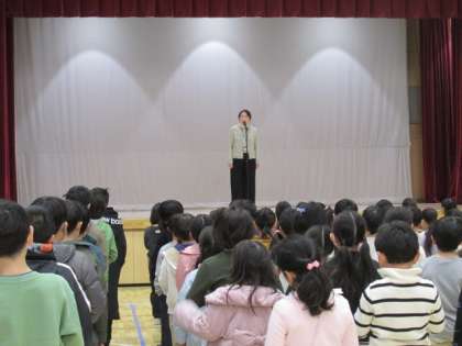 新年あけましておめでとうございます。今年もよろしくお願いいたします。令和7年1月8日(水)3学期の始業式を迎えました。体育館に集まり新年のあいさつを皆でしました。校長先生からは、新しい年を迎えて、新しい自分になるために努力を続けること、「友情は喜びを2倍にし、悲しみを半分にする」という言葉の紹介から友達の大切さについてお話がありました。代表児童は、3学期に向けて抱負を述べました。展覧会や6年生としての意気込みなど、立派に発表することができました。3学期は560名の児童でのスタートです。お互いに思いやり、助け合い、高め合いながら充実した3学期になることを願っています。