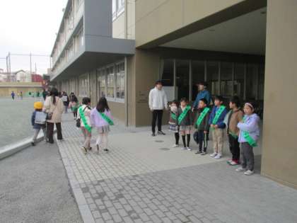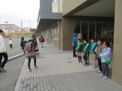 今週のあいさつ当番は、14班です。担当の子どもたちはたすきをかけて、張り切ってあいさつをしています。「進んで元気よくあいさつをしよう」が本校の目標です。学校でも家庭でも、そして地域でも気持ちのよいあいさつが自分からできる子どもたちを育てていきたいです。