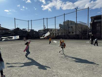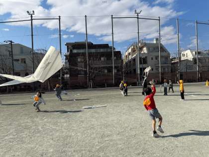 生活科の学習の一環で、オリジナルの凧を作り、校庭で飛ばしました。