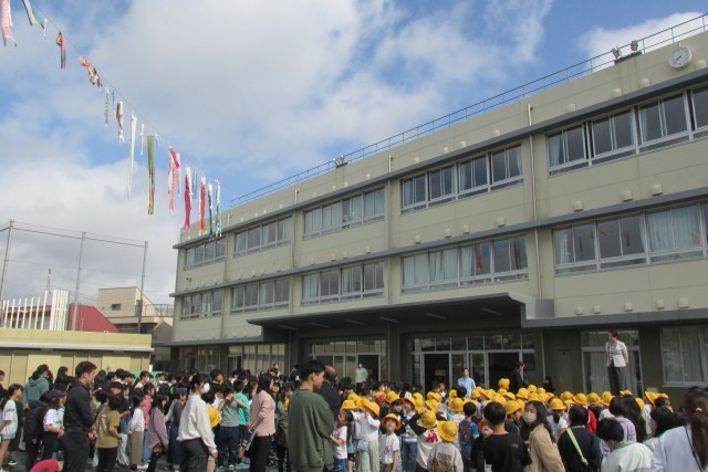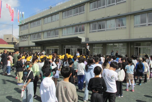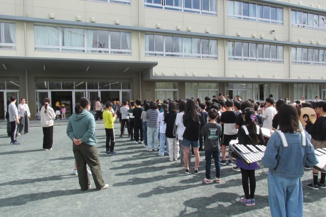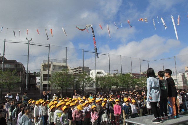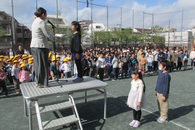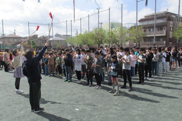 写真は順に6年児童のあいさつ、校長講話(登校時刻は8時20分まで、PTA・地域の方々による鯉のぼり掲揚について等)、表彰、看護当番の話(今週の目標「校舎内は右側を静かに歩こう」について)、鼓笛隊演奏です。