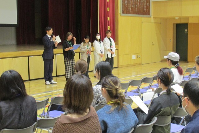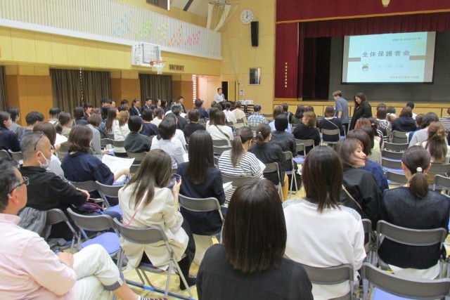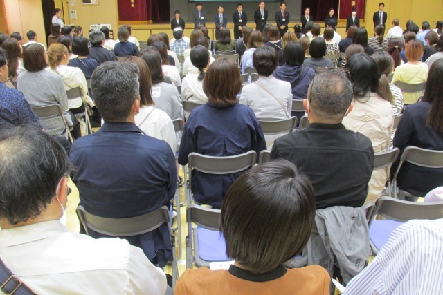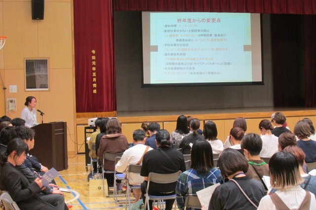 写真は全体会の様子です。順に校長挨拶、教職員紹介、学校経営方針等説明、PTAからです。