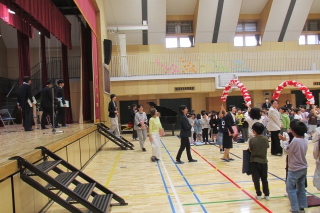 退場は6年鼓笛隊の演奏と、5年花のアーチ、子どもたちの拍手により送りだしました。