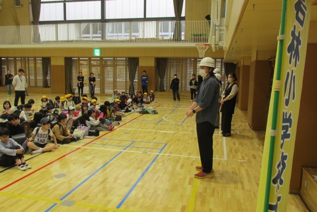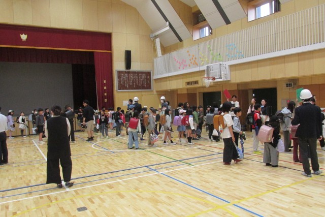 残留児童は体育館に集合し、色別コースごとに教員引率で集団下校しました。