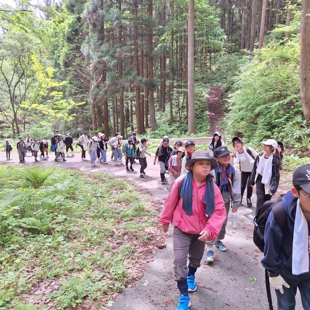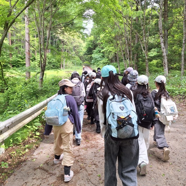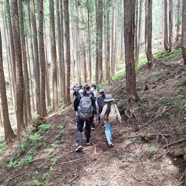 森の中は、若干空気が冷たく、心地よい気候の中ハイキングをスタートしました。深緑の山々や森林、いくつもの鳥のさえずりなど、東京では味わえない森林ハイキングをたっぷり楽しみました。アップダウンがきつい道もありましたが、お互いに励まし合いながら頑張って歩きました。午後は、マスつかみと木札作りが待っています。