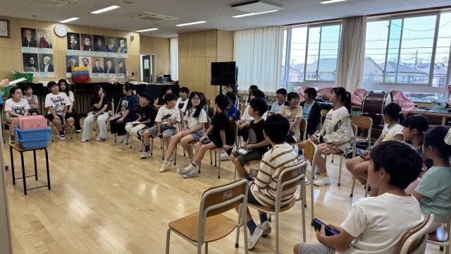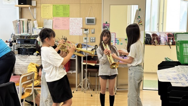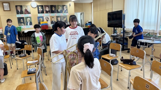 昨年度までの経験者を中心に、4年生に楽器の吹き方を教えています。