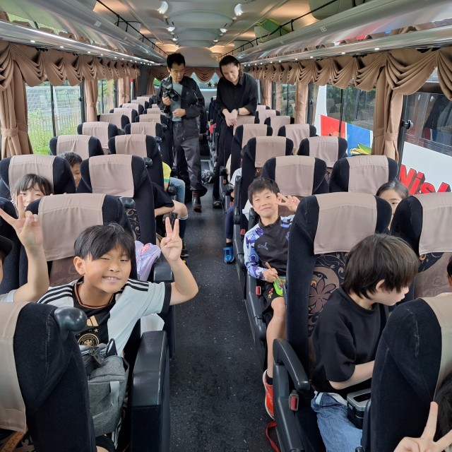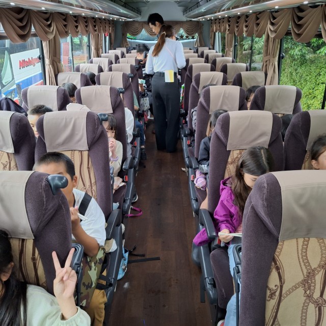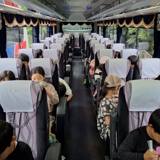次太夫堀公園の見学後は、お待ちかね昼食タイムです。雨天のため、バスの車内でお弁当を食べました。隣の座席の友達と楽しく会話をしながら、いただきました。