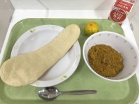ミートボールスパゲッティビーンズサラダフルーツヨーグルト牛乳スパゲッティのソース...