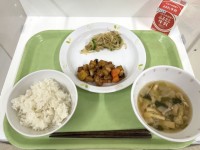 ごはん鶏肉と大豆の揚げ煮もやしときゅうりのあえ物えのきのみそ汁牛乳鶏肉と大豆の揚...