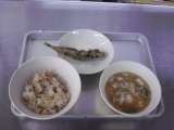 献立名 さといもごはん 牛乳 ししゃものいそべ揚げ みそ汁 主な食材の産地 米(...