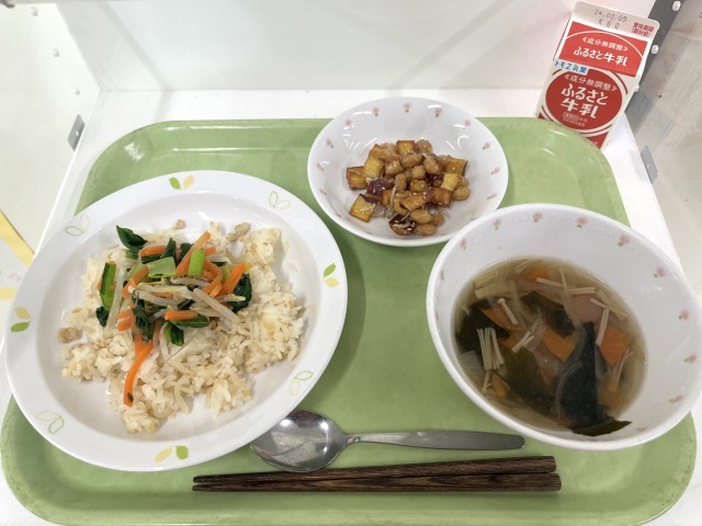ビビンバ大豆とじゃこの甘辛あげわかめスープ牛乳