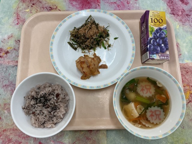 ⭐︎献立⭐︎・赤飯・鶏肉の照り焼き・ほうれん草の乾物あえ・どんどん汁・ぶどうジュ...