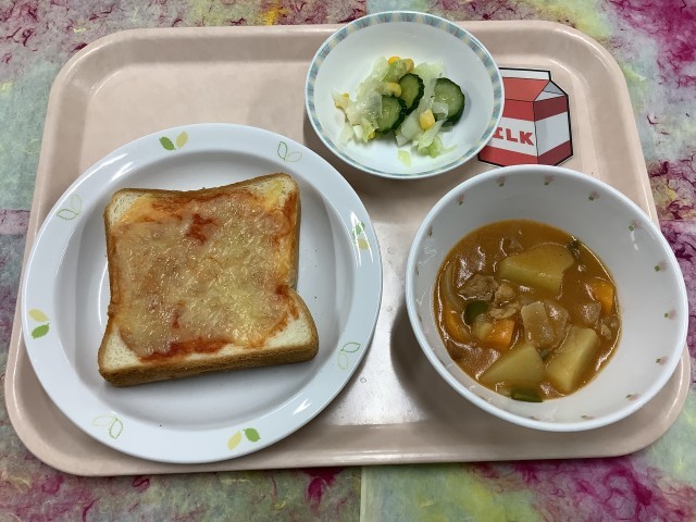 1学期の給食もあと3回となりました。今日はパンが主食の献立です。トーストやシチューの具材にトマトやピーマンなどの夏野菜が隠れています。今日は湿度が高く汗をかきやすいので牛乳などで水分補給をしましょう。