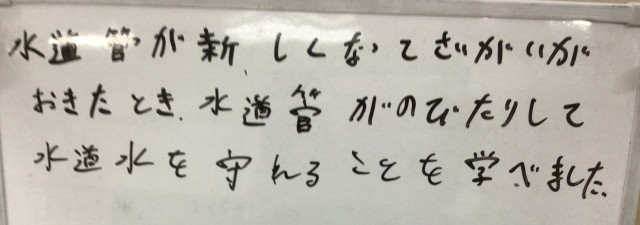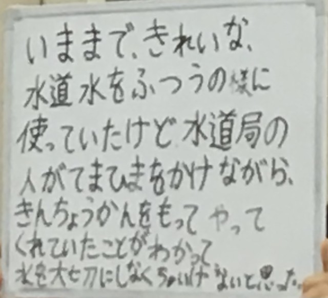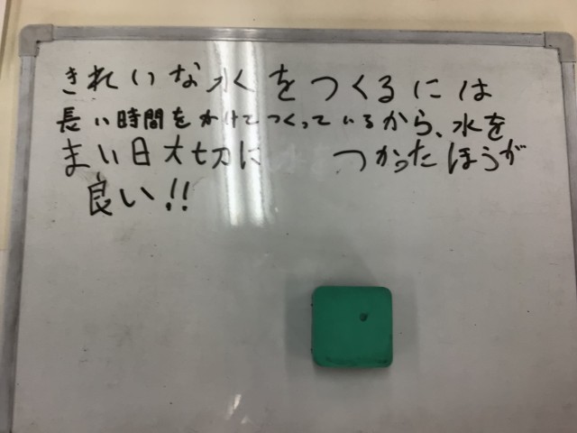 前回の「下水道」とは違い、今度は、生活の中で使用する水。蛇口をひねると当たり前のように綺麗な水が出てくるけど・・・社会科で学習したことの「応用編」ということで、復習しながら実験をして考えを深めていきました。