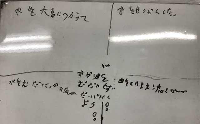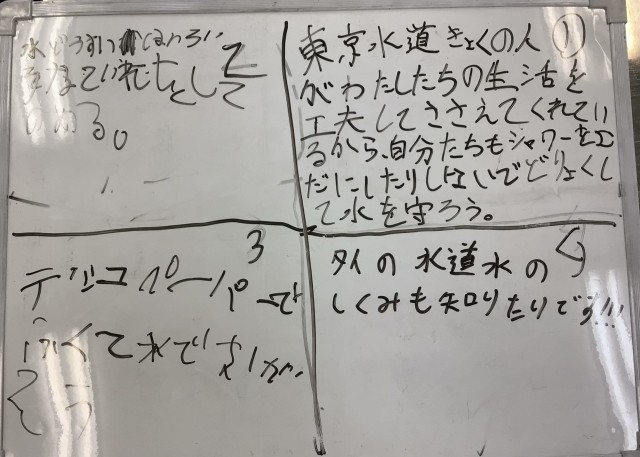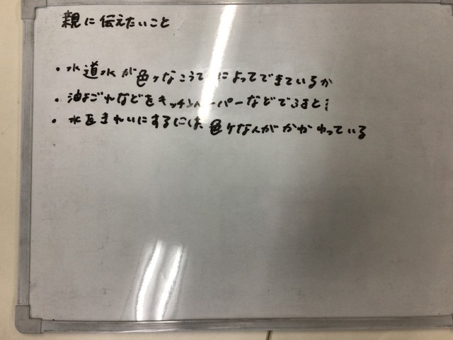 授業の最後には、みんなが学習したことでお家の人に何を伝えたい?と聞かれて班で意見をまとめました。
