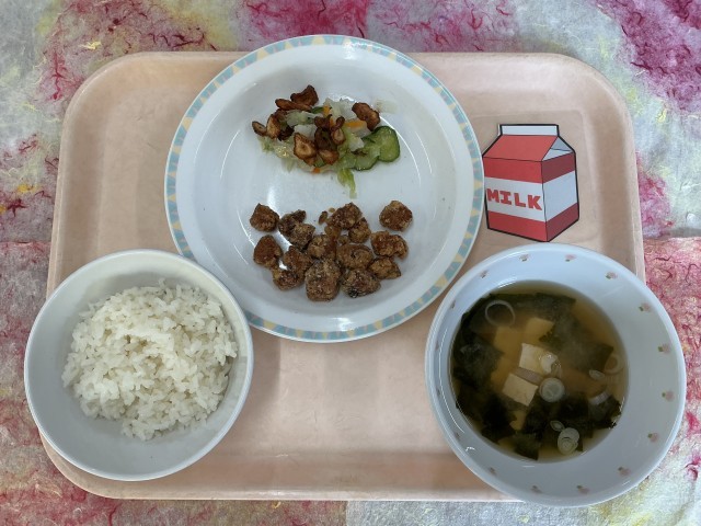 今日は戻り鰹を使った竜田揚げです。コロコロしていてお箸の練習になりそうですが、給食室で味付けして油で揚げました。残さず食べてくれたら嬉しいです。今日は湿度が高くて汗をかきやすいので水分補給をしっかり行いましょう。