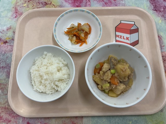 今日は和食の献立です。じゃがいものそぼろ煮や白菜のおかかかけには、和食に欠かせない「かつおの削り節」が使われています。今日も外は暑いので水分補給を忘れずにしましょう。