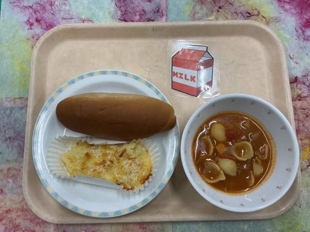 今日はパンが主食の献立です。ひとつずつカップに入れて手作りしたポテトクリーム焼きもミネストローネも調理さん達が一生懸命作りました。みんなが美味しく楽しく食べてくれたら嬉しいです。