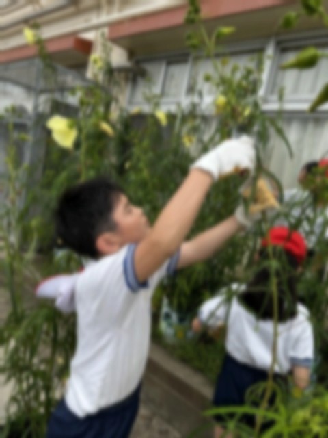 4年生が1学期に苗から育てているハナオクラ。採取される粘液がネリとして和紙作りに使われます。かなり立派に育っていて、子供たちの背丈を超えています。より根を逞しくするべく、今日は剪定作業を行いました。