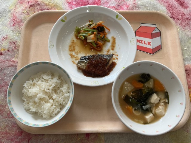 今日はお魚が主菜の和食献立です。焼いたさばに少し甘酸っぱいソースをかけました。最近、卒業生と話す機会があり「給食のおみそ汁が好きだった」と教えてくれました。おみそ汁の日は、朝からお出汁のいい匂いが給食室に漂います。今日のおみそ汁もほっとする味に仕上がりました。残さず食べてくれたら嬉しいです。