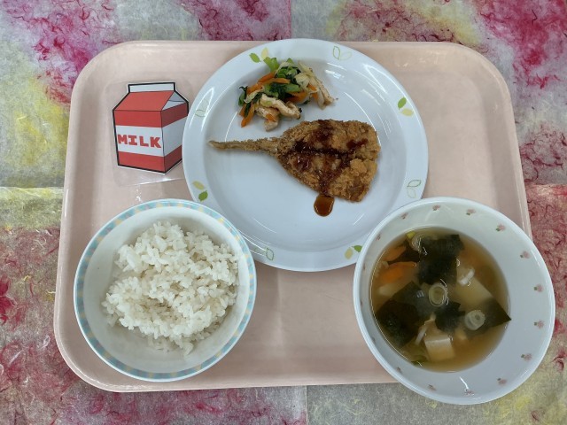 今日はお魚が主役の献立です。給食室の調理さん全員でお魚の調理をしました。おひたしやおみそ汁も、脇役になりがちですが和食には欠かせない料理です。どれもみんなが美味しく食べてくれるようにと一生懸命作りました。残さずしっかり食べましょう。