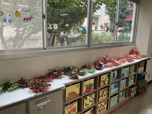 以前作った空想の生き物にクレパスやポスカでカラフルな模様をプラス。巣には本物の枝や木の実を使い、まるで森の中にあるように仕上がりました。次回は卵を加えて、生物と卵がいっしょにいる様子を表現します。
