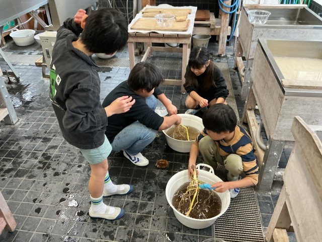 6月から育てていたトロロアオイの根を取り出す作業をしました。ぐんぐん成長して、子供達の身長を超えるくらい大きくなったトロロアオイ。和紙の原料として使うのは、根の部分。袋から取り出して見ると、立派な根が!!洗って、叩いて柔らかくして、使用する時まで冷凍保存しました。